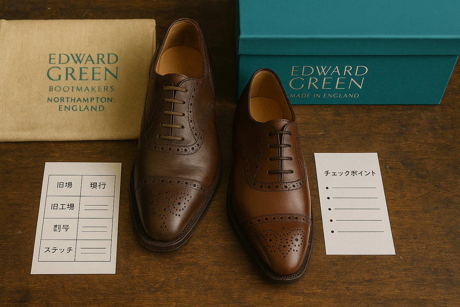 ラグジュアリーシューズ・イメージ エドワードグリーンのロゴは、実は年代によって細かな違いがあり、その変化を知ることで靴の歴史や価値までも読み解くことができます。 古い刻印が残るヴィンテージから現行モデルまで、どこが変わり、何が手掛かりになるのか…。ロゴを「見るだけ」で製造年代が分かるようになるポイントをわかりやすく解説します。 さらに、フォントや刻印位置の微妙な差異は、製造当時の技術や工房の特徴を反映しており、知れば知るほど奥深い魅力に気付くはずです。 中古市場で価値判断の基準にもなるため、購入前に理解し ...