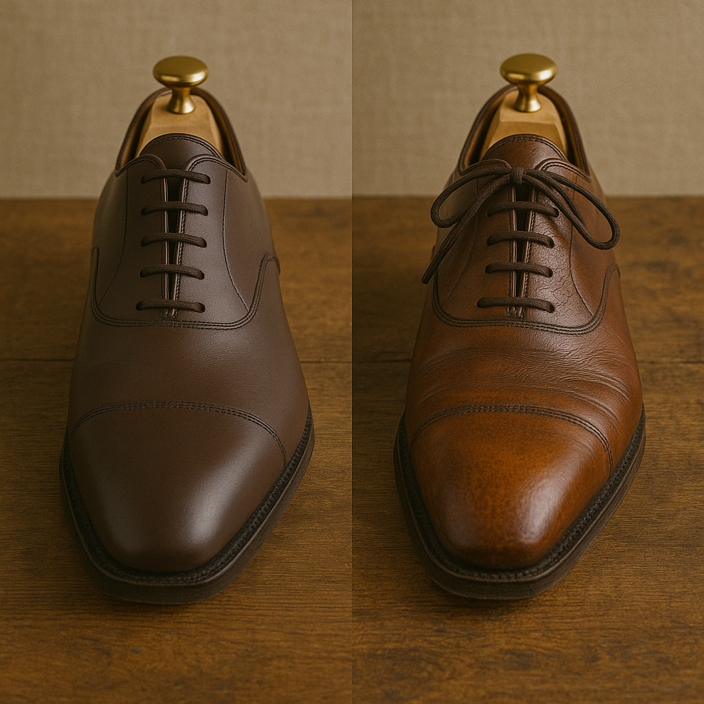 さらに、これらのカラーは元々深みのある色合いでありながら、履き込みとケアによって奥行きが強まり、まるで異なる靴のように見えるほど印象が変わることもあります。
