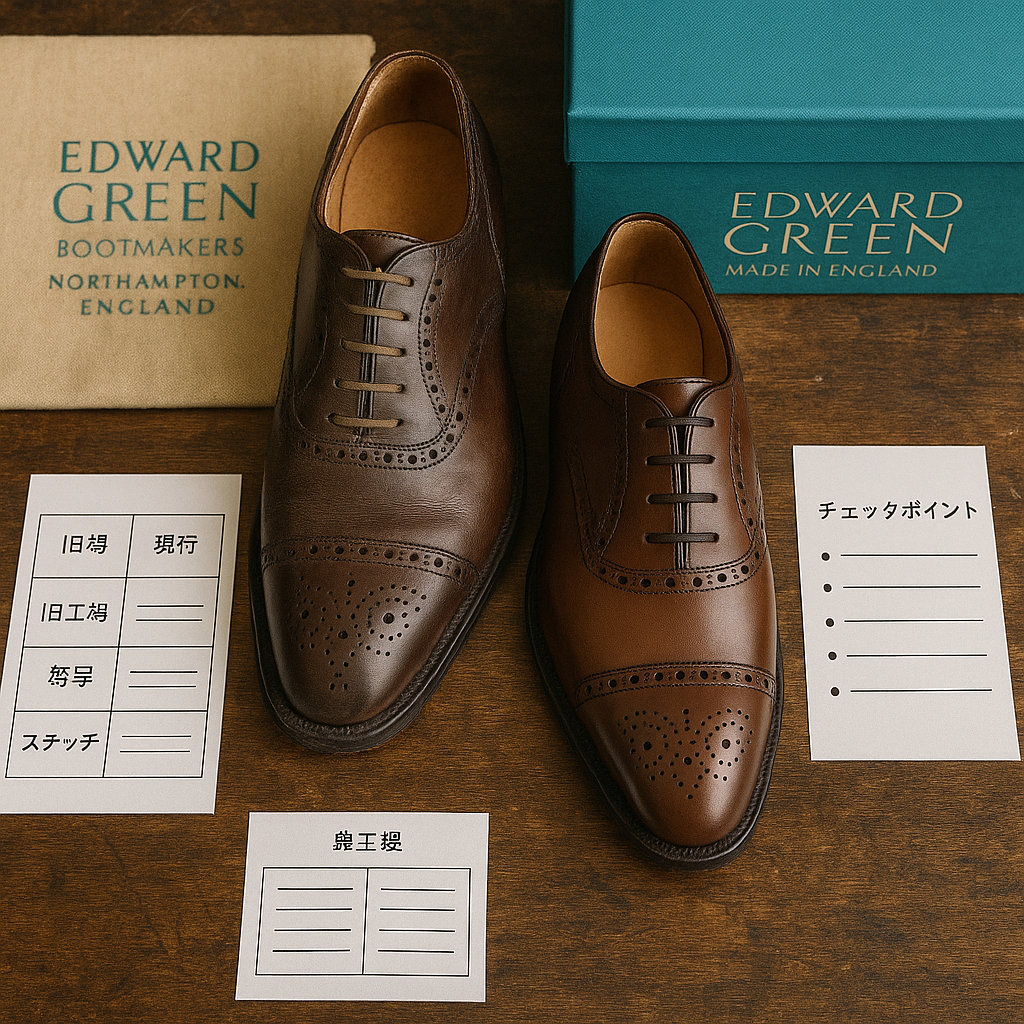 エドワードグリーン(Edward Green)はイギリスの高級紳士靴ブランドとして知られていますが、現行品と旧工場製のモデルには細かなディテールの違いがあります。